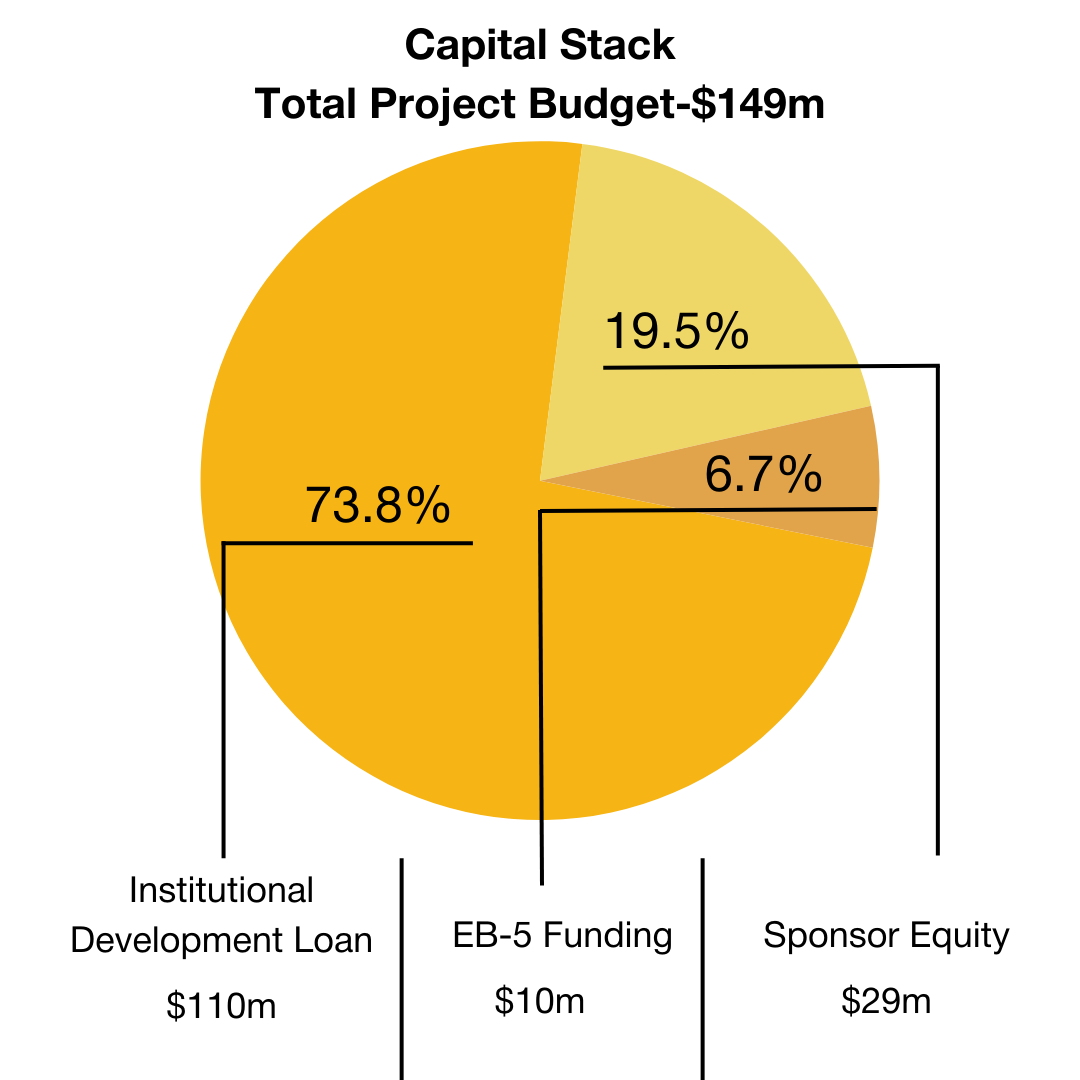 The Sponsor has contributed $29M in equity for the project. The Job Creating Entity closed on a loan in June 2023 from Beachpoint Capital Management of up to $120M in additional funding as a development loan.